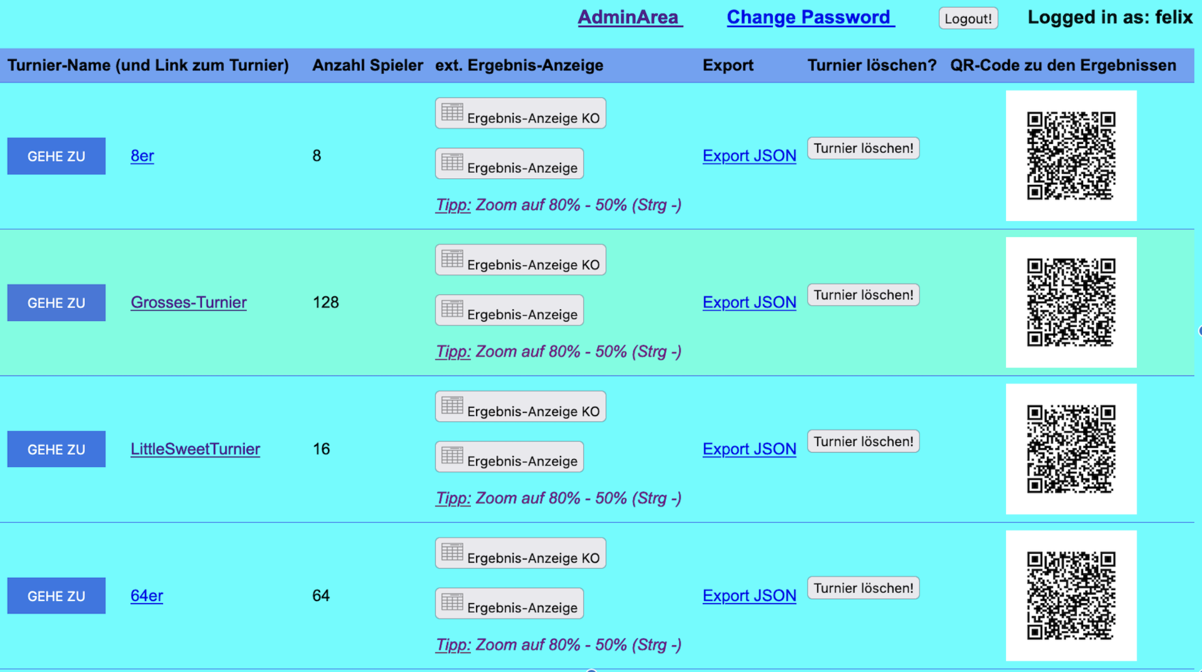 - die Turnier-Übersicht, der "Verwaltungszentrale" über ihre angelegten Turniere mit praktischen Links (rechts).